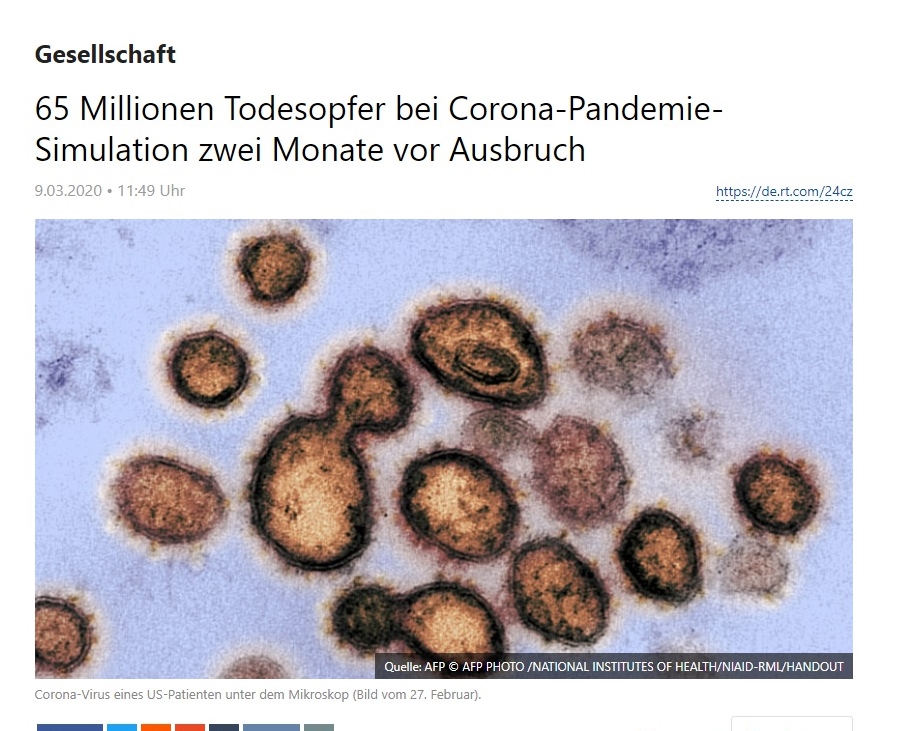 Στις 11 Μαρτίου 2020, η γερμανική (αριστερή) ιστοσελίδα "Neue Rheinische Zeitung NRhZ" επέστησε την προσοχή (άρθρο "Two Corona Mosaic Stones") σε μια δημοσίευση της γερμανικής κυβέρνησης τον Ιανουάριο του 2013: "Πληροφορίες από τη γερμανική κυβέρνηση - Έκθεση για την ανάλυση κινδύνου στην πολιτική προστασία 2012 "(έντυπο 17/12051 της 3ης Ιανουαρίου 2013). Σε αυτό, μπορούν να φανούν τρομακτικές ομοιότητες με αυτό που συμβαίνει σήμερα - ιδιαίτερα αναφέροντας ρητώς τον «κοροναϊό του SARS (CoV)». Το σενάριο που παρουσιάστηκε, στο οποίο περιγράφονται η εξάπλωση, η πορεία, η διάρκεια, η θνησιμότητα κ.λπ., φτάνει στο σημείο να απαιτεί ένα δραστικό περιορισμό των θεμελιωδών δικαιωμάτων.